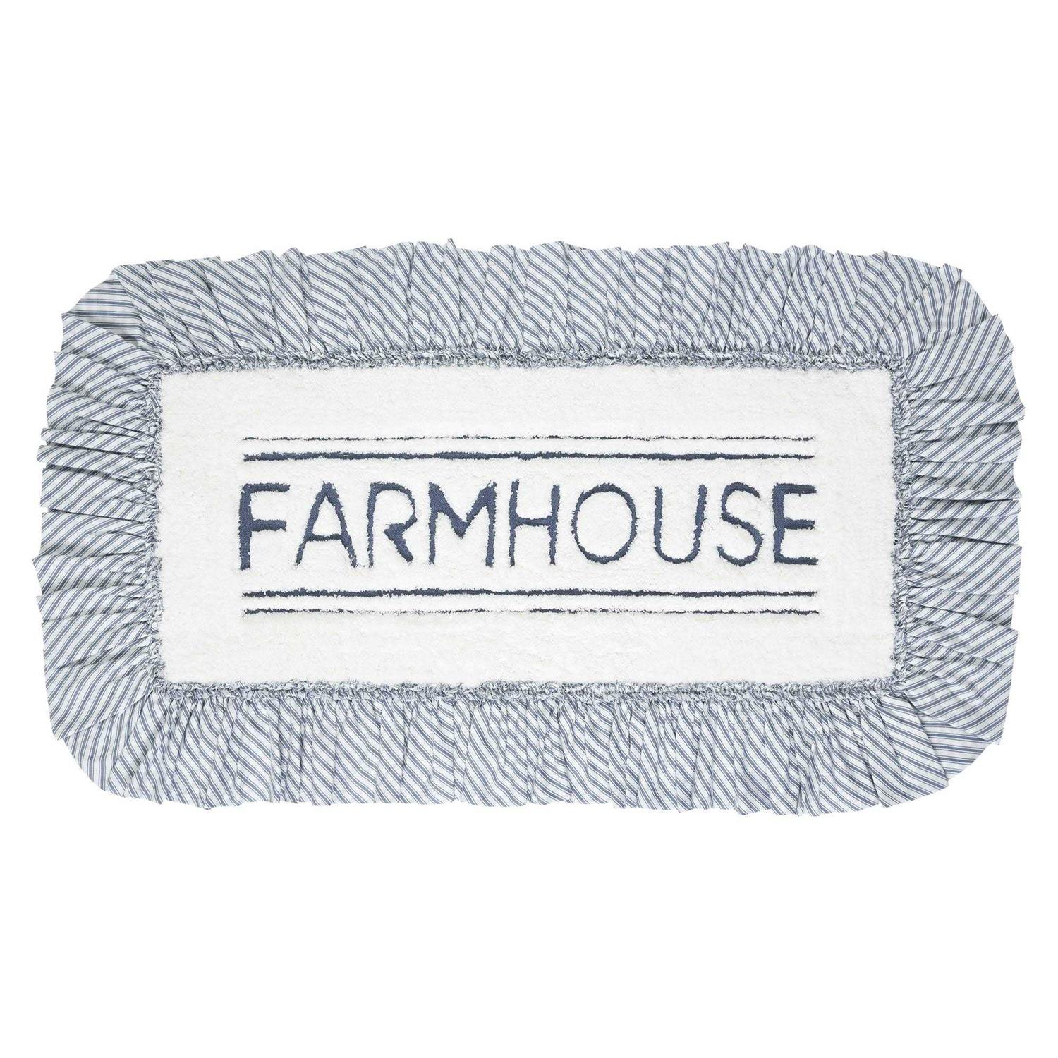 Bathmat Sizes: 20′′ x 30′′ 27′′ x 48′′ Step out of the shower and into a cozy modern farmhouse bliss. A high-quality core provides a thick cushion to sink your feet into and durable cotton to absorb water providing a safe and comfortable post-shower landing. It is trimmed with a ruffled ticking stripe fabric in dusty blue and white. The center of the rug features bold embroidery of “Farmhouse” in a clean and simple font. Backed with textured rubber to produce a quality, non-slip surface without the need for a separate rug pad. This ruffled bath mat is a great finishing piece for bathrooms or laundry rooms where you need the perfect balance of style and functionality. Versatile styling is sure to match country chic, farmhouse, or cottage decor. Perfect addition for the Christmas holiday or year-round. Care Instructions— Machine wash on a delicate cycle and lay flat to dry.